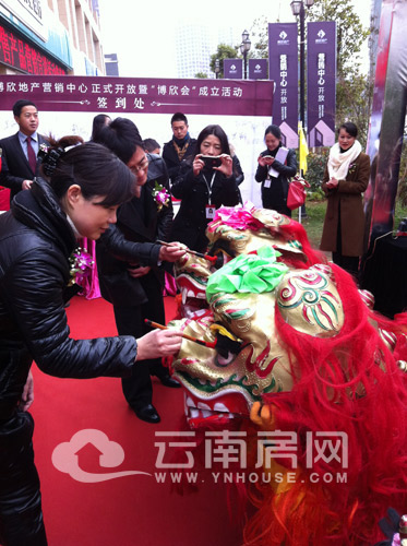 上午10:00,營銷中心開發儀式正式開始。在醒獅表演完之后,博欣地產相關領導分別為醒獅點睛,并用紅酒灌滿“博智者歡”的透明水晶器皿,寓意吉祥、財運以及開門大吉。隨著營銷中心門頭大彩球被拉開,博欣地產營銷中心正式開放。在今天上午的活動上,博欣地產“博欣會”(全稱為“云南博欣房地產開發有限公司客戶會”)也正式揭牌。未來,該組織除為業主提供對口服務外,參加該客戶會的業主,還將享受額外的購房優惠等待遇。