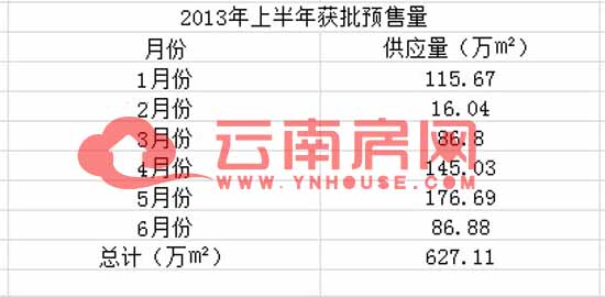 2013年上半年昆明預售證發放情況報告:62項目627萬方獲準售 同比上漲19.78%