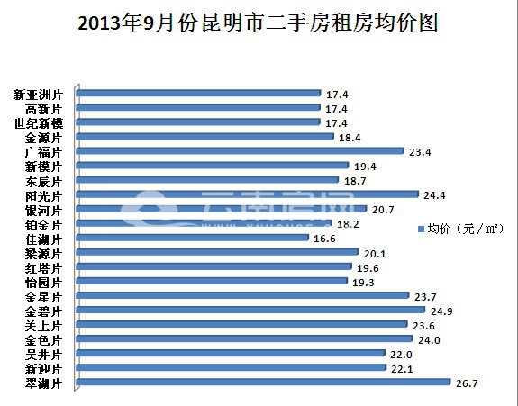 租房方面,從數(shù)據(jù)來(lái)看,昆明市2013年9月份二手房租房成交均價(jià)為20.86元/㎡,與8月份持平。