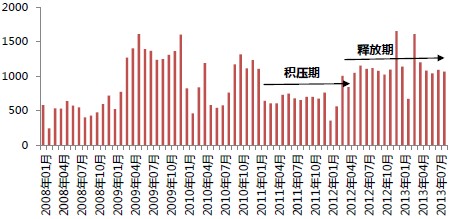 從市場面來看,房價漲跌是受供求關系因素影響,而由于存量的持續減少,我們預計未來房價將先漲后穩。首先,房價短期內會持續上漲是因為存量已經逐月跌至歷史最低水平,由于前幾年土地供應過少,致使今年成交釋放之后各城市存量水平直線下降,南京消化周期已不足5.2個月,而北京也不足6.1個月。存量的持續減少,使得市場供應不能夠跟上持續釋放的市場需求。但是,這種供不應求的態勢在四季度和明年會有所改觀,從而放緩房價的上漲勢頭:一方面,從企業的角度來看,今年上半年開始,各大企業紛紛加大新開工面積,典型企業如世茂,2013年上半年新開工面積甚至達去年同期的5.61倍之多;另一方面,從城市的角度來看,多數城市今年四季度開始將大幅增加商品住宅的供應量水平來緩解目前的供求矛盾,上海將在10月推出26個全新項目,較9月增加44%。