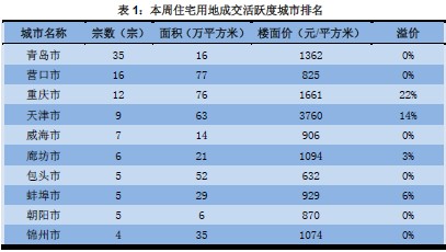 本周住宅用地成交活躍度排行榜前三名的城市為青島市、營口市和重慶市。青島市成交住宅用地35宗,分布在即墨市和膠南市,合計16萬平方米,樓面均價為1362元/平方米,平均溢價率0%;營口市成交住宅用地16宗,全部位于大石橋市,合計77萬平方米,樓面均價為825元/平方米,平均溢價率0%;重慶市成交住宅用地12宗,分布在合川區、萬盛區、大渡口區、沙坪壩區和銅梁縣,合計76萬平方米,樓面均價為1661元/平方米,平均溢價率22%。