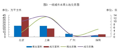 一線城市均有地塊推出,推出量減少。本周一線城市共推出土地22宗,較上周增加7宗,推出土地面積54萬平方米,較上周減少7萬平方米。北京和上海有住宅用地推出,共計3宗,合計26萬平方米。