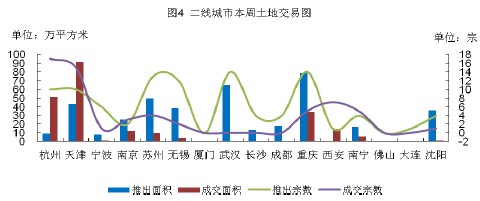 二線城市有10個城市有土地成交,成交量減少。本周二線城市共成交土地60宗,較上周減少25宗,成交面積226萬平方米,較上周減少84萬平方米,環比減少27%。其中,天津成交15宗,共計92萬平方米,杭州成交17宗,共計51萬平方米,為成交量較大的城市。本周有7個二線城市有住宅用地成交,其中天津成交6宗,共計46萬平方米,為住宅用地成交量最大的二線城市。