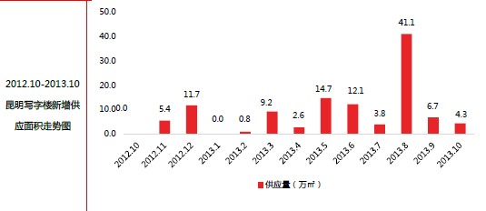 2013年9月份,昆明寫字樓新增供應4.3萬㎡,環比下降37%。