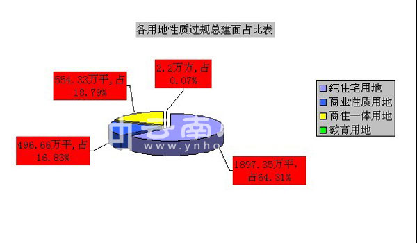 2013年,昆明過規土地仍以純居住用地性質的地塊為主。純居住性質的用地共計有94宗過規,凈用地面積達到497.6055184萬平米,總建筑面積達1897.3486953萬平米,占到總過規建筑面積的64.31%。商業性質用地,包括純商業用地及商務辦公用地,2013年過規土地宗數50宗,凈用地面積134.479955萬平米,總過規建筑面積達496.656361萬平米,占總過規建筑面積的16.83%。商住一體用地有32宗土地過規,總凈用地面積295.0830958萬平米,總建筑面積達554.3295127萬平米,占總過規建筑面積的18.79%。教育用地有2宗過規,凈用地面積2.68793萬平米,總建筑面積2.203132萬平米,占總過規建筑面積的0.07%。