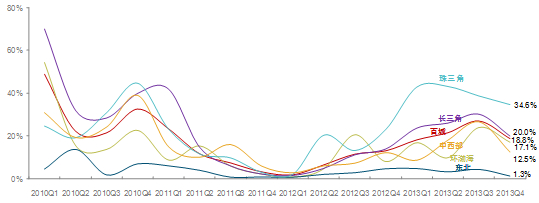 各區(qū)域樓面均價同比均為上漲,珠三角地區(qū)樓面均價及同、環(huán)比漲幅均居五大區(qū)域首位。2013年四季度珠三角地區(qū)住宅用地樓面均價為3975元/平方米,為2012年三季度以來首次超過長三角地區(qū),位居五大區(qū)域之首,同、環(huán)比分別大幅上漲62.6%和30.7%,漲幅均為五大區(qū)域最高,廈門是該區(qū)域地價最高的城市,樓面均價為13831元/平方米,同比大幅上漲441.1%;長三角地區(qū)樓面均價為3329元/平方米,排名第二位,同比上漲1.3%,為各區(qū)域中最小漲幅,該區(qū)域地價最高城市為南京,達11976元/平方米,同比上漲134.3%;環(huán)渤海地區(qū)為2568元/平方米,略高于百城平均水平(2495元/平方米),同環(huán)比分別上漲53.9%、1.1%,其中北京住宅用地樓面均價為9523元/平方米,在該區(qū)域價格最高,同比上漲71.2%;中西部地區(qū)樓面均價為1678元/平方米,環(huán)比下降19.1%,降幅最大,其中贛州樓面均價最高,為2787元/平方米;東北部地區(qū)樓面均價為1617元/平方米,為五大區(qū)域最低,同比上漲2.2%,其中沈陽樓面均價最高,為2118元/平方米。長三角、珠三角和環(huán)渤海地區(qū)樓面均價高于百城平均水平,東北、中西部地區(qū)均低于百城平均水平。價格最高的珠三角地區(qū)和最低的東北地區(qū)差距縮小至2357元/平方米。