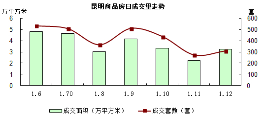 商品房成交量開始上揚。本周(1.6-1.12)昆明樓市成交在連續兩個月下滑后開始上揚,共成交商品房25.43萬平方米,環比上漲11.53%;商品房成交套數為2929套,較上周增加475套,環比增長19.36%;本周昆明商品房套均成交面積為86.83平方米,較上周每套減少6.10平方米。