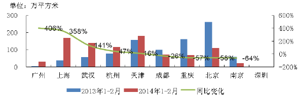 圖1:2014年1-2月10重點城市住宅用地供應(yīng)情況