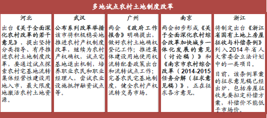 多地再推土地改革。各地兩會陸續召開,加快推進土地改革,通過試點探索農村土地入市流轉成為各地會議熱點。農村土地改革是十八屆三中全會的重點,也是今年經濟工作的重心。繼安徽后,多個省市相繼出臺政策試點改革,推動農村經營性建設用地同權同價入市,這將加強相關省市的土地供應,并對增加農民收入、平抑城市地價起到積極作用。