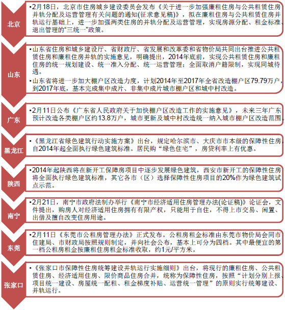 保障房仍是政府工作重點。2月19日,國新辦舉行困難群眾基本生活和住房保障等方面情況新聞發布會。其中住房和城鄉建設部表示,《城鎮住房保障條例》正在修改,爭取把條例盡快上報國務院,公開征求社會的意見。此前國務院去年9月底在常務會議上明確要求加快住房保障立法。同時,各地也繼續出臺相應條例,推動保障房建設進程。其中棚戶區改造、廉租房公租房等并軌、發展綠色建筑是此輪保障房相關政策的主要關注點。