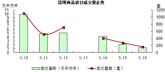 本周昆明樓市的成交波動較大,3月10日成交套數(shù)達到了1111套,成為進入2014年后昆明商品房首次單日成交破千的紀錄,而3月11日成交套數(shù)就下滑近一半,3月12日又略有上浮,然后逐天遞減。