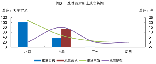 一線城市北京、上海和廣州有地塊推出,推出量減少。本周一線城市共推出土地30宗,較上周增加12宗,推出土地面積140萬平方米,較上周減少72萬平方米。一線城市均無住宅用地推出。