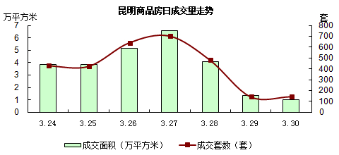 本周(3.24-3.30)昆明商品房日均成交約424套,日均成交面積約3.70萬平方米。其中周四(3月27日)成交套數最大,共成交704套(6.58萬平方米),占周成交總量的比例為23.74%;周日(3月29日)成交套數最小,共成交143套(1.33萬平方米),占周成交總量的比例為4.82%。