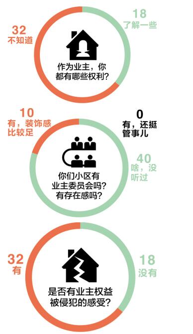 在記者發放的50份問卷調查中,32人表示自己曾有過物權被侵犯的感受或經歷。但苦于找不到合適的維權路子,大部分業主只能算了。業內人士分析,昆明的業主委員會發展根本沒有達到預期目標,“一方面業主委員會的普及率不高,基層政府部門并沒有發揮相關的引導作用,這就造成了維權難問題。另外一方面,已有的業主委員會也由于參與度不高等問題,出現了‘裝飾化’的傾向,不能夠為業主解決一些實實在在的訴求。”