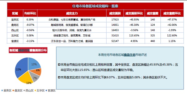 本周全市商品住宅成交相比上周有所回落,其中呈貢區、盤龍區跌幅達45.93%及45.38%;五華區環比大漲115.65%;西山區和官渡區成交量較為平穩。