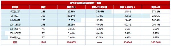 本周全市商品房成交出現(xiàn)大幅下降,成交主力集中在60-80萬、100-150萬兩個(gè)總價(jià)段里,分別占比26.14%及25.28%;60萬以下總價(jià)段產(chǎn)品本周成交下降16.99%,其余總價(jià)段起伏不大。