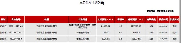本周土地供應(yīng)三宗,位于昆明主城西山區(qū),以城鎮(zhèn)住宅用地為主;土地成交一宗,位于呈貢區(qū),土地用途為倉儲用地。