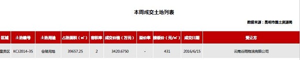 本周土地成交一宗,位于呈貢區(qū),土地用途為倉儲用地。