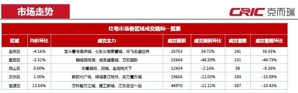 本周全市商品住宅成交除呈貢區上漲34.72%以外,其余四區均出現不同程度下降,其中盤龍區跌幅最大,達46.59%。