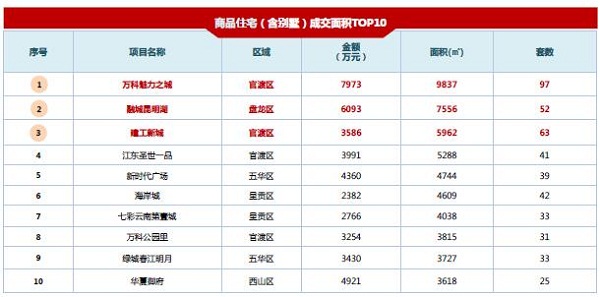 點評:本周萬科魅力之城獲得成交面積榜冠軍,融城昆明湖排第二位,建工新城連續兩周入圍前三;改善型項目華夏御府本周上榜,官渡區有多個項目進入前十。