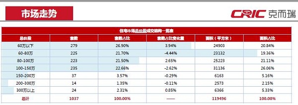本周由于呈貢區商品房成交量上升,因此60萬以下總價段產品為本周成交主力,套數占比上升3.94%;其余成交主要集中在總價150萬以下產品段。