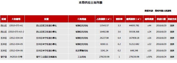 本周土地供應六宗,五宗位于昆明主城區,一宗位于晉寧縣,以城鎮住宅用地為主;本周土地無成交。