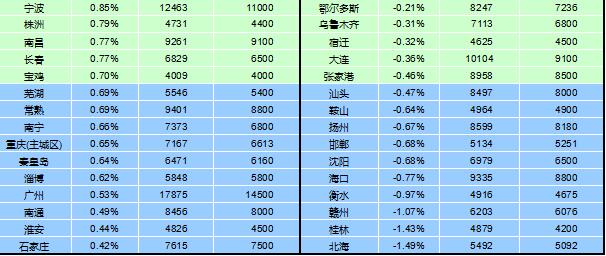 2016年6月,住宅價格環比2016年5月上漲的城市個數為73個,較上月減少1個。漲幅居前十位的城市依次是:南京、廈門、嘉興、溫州、廊坊、佛山、武漢、合肥、昆山、蘭州。具體來看,南京、廈門、嘉興、溫州漲幅相對較高,在3%-4%之間;廊坊、佛山、武漢、合肥、昆山、蘭州漲幅在2.17%-3.00%之間。其他環比上漲的63個城市中,東莞、宜昌等20個城市漲幅在1.00%-2.16%之間;保定、太原等17個城市漲幅在0.5%-1.0%之間;南通、淮安等26個城市漲幅在0.5%以內。紹興、西寧等5個城市房價與上月持平。