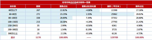 本周全市商品房成交量上升,其中60-80萬、 80-100萬為本周成交主力,分別占總套數的23.25%、 28.89%,環比略漲1.55%及7.39%。