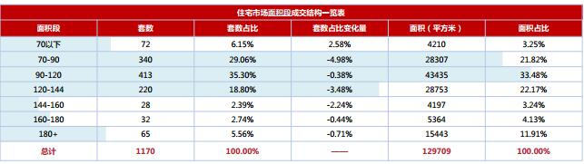 本周成交主力依然集中在70-90㎡、 90-120㎡、 120-144㎡三個面積段,分別占全周成交套數的29.06%、 35.30%及18.80%,總體來說市場平穩,波動不大。