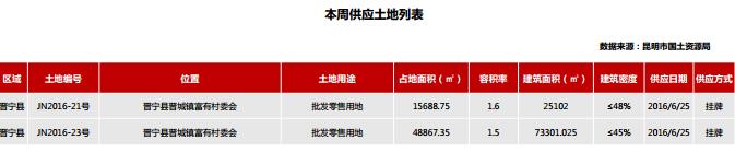 本周土地供應二宗,位于晉寧縣,土地用途為批發零售用地;本周土地成交七宗,位于官渡區和晉寧縣,以工業用地和城鎮住宅用地為主。