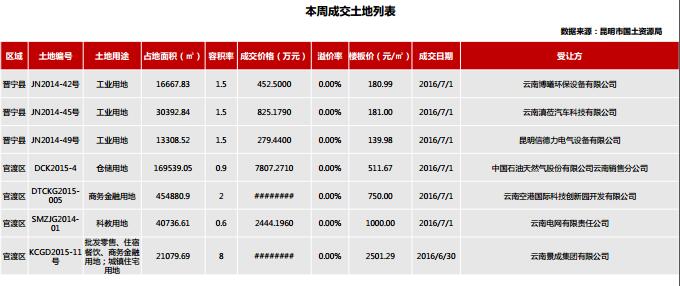 本周土地供應二宗,位于晉寧縣,土地用途為批發零售用地;土地成交七宗,位于官渡區和晉寧縣,以工業用地和城鎮住宅用地為主。