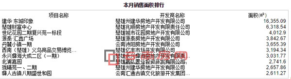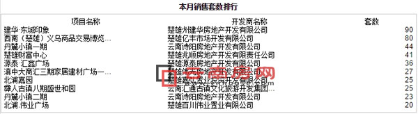 截至2016年7月31日23:00,根據楚雄房產信息網的統計,2016年7月楚雄商品房銷售套數、銷售面積各十強名單出爐。其中,銷售套數排行前三的項目分別是:建華·東城印象,售出90套;西南(楚雄)義烏商品交易博覽城,售出80套;丹麓小鎮一期,售出44套。銷售面積排行前三的項目分別是建華·東城印象,售出16355.09平米;楚雄財富中心,售出6318.54平米;世紀花園二期復興苑一標段,售出4012.9平米。
