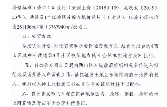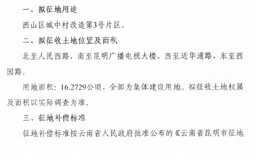 西山區(qū)政府發(fā)布土地征收公告,擬征收棕樹營街道辦事處城中村改造3號片區(qū)共16.2729公頃,約合244畝土地。公告顯示,擬征收土地范圍為北至人民西路、南至昆明廣播電視大樓、西至近華浦路、東至西園路,共涉及棕樹營街道辦事處上栗村、下栗村、江家橋村、紅聯(lián)新村四個城中村,征地補(bǔ)償標(biāo)準(zhǔn)為251196元/畝。具體公告原文如下: