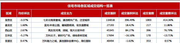 本周全市商品住宅成交出現大幅度增長,漲幅最大為呈貢區96.49%,其次為西山區上漲84.27%,盤龍區18.42%;五華區、官渡區逆勢下降16.10%及1.63%。本周全市各區商品住宅成交均價起伏不大,盤龍區、西山區及官渡區分別略漲1.60%、 2.67%、0.47%。