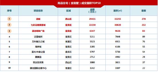 點評:本周潤城、七彩云南第壹城、 滇池明珠廣場獲得榜單前三甲,呈貢區共有五個項目進入成交面積榜;新項目藍光·林肯公園上榜,成績亮眼。