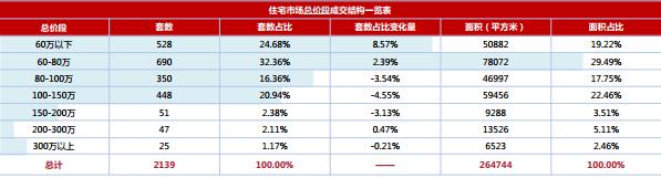 本周全市商品房成交集中于60萬以下、 60-80萬、 100-150萬三個總價段,分別占總套數的24.68%、 32.36%及20.94%,由于呈貢區成交量大漲,因此60萬以下總價段漲幅明顯,為8.57%。