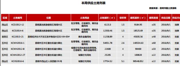 本周土地供應十五宗,其中尋甸縣三宗、西山區八宗、呈貢區一宗、五華區三宗;以工業用地、城鎮住宅用地兼容批零零售、住宿餐飲、商務金融用地為主;本周土地成交十宗,二宗位于晉寧縣,土地用途為工業用地;八宗位于官渡區,均以底價成交。