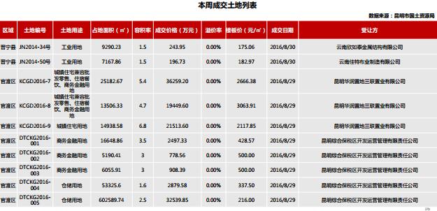 本周土地供應十五宗,其中尋甸縣三宗、西山區八宗、呈貢區一宗、五華區三宗;以工業用地、城鎮住宅用地兼容批零零售、住宿餐飲、商務金融用地為主;土地成交十宗,二宗位于晉寧縣,土地用途為工業用地;八宗位于官渡區,均以底價成交.