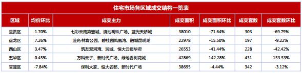 本周全市商品住宅成交出現(xiàn)下滑,不過五華區(qū)逆勢上漲142.18%;其余各區(qū)均不同程度下降,呈貢區(qū)跌幅最大,達(dá)71.64%。本周全市各區(qū)商品住宅成交均價(jià)盤龍區(qū)上漲7.26%,其次為西山區(qū)上漲3.47%;官渡區(qū)跌幅達(dá)7.84%,其余各區(qū)起伏不大