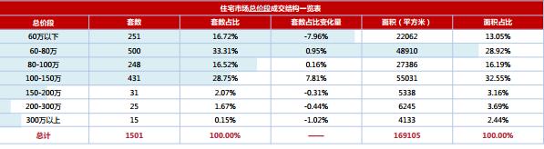 本周全市商品房成交集中于60-80萬、 100-150萬兩個(gè)總價(jià)段,分別占總套數(shù)的33.31%及28.75%;由于呈貢區(qū)成交量下降明顯,60萬以下總價(jià)段也因此下降7.96%。