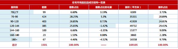 本周成交集中于70-90㎡、 90-120㎡、 120-144㎡三個(gè)面積段,分別占全周成交套數(shù)的28.25%、 26.85%及25.65%;各面