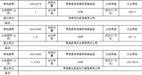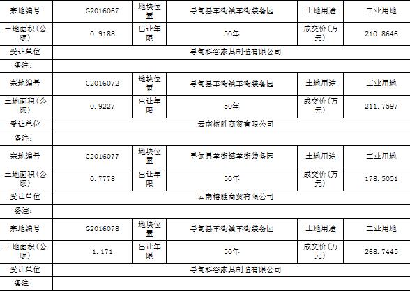 近日,尋甸回族彝族自治縣國土資源局發布了位于尋甸縣羊街鎮羊街裝備園,土地編號為G2016055號等19宗工業用地的成交結果公示,具體公示情況如下: