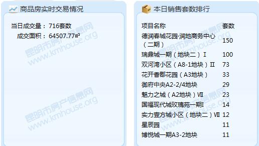 截至2016年10月10日22:51,昆明市房產信息網成交數據顯示,2016年10月10日昆明成交商品房套數為523套。較之昨天的523套,增加了193套;成交面積64507.77平米。今日成交套數排行前三的項目分別是:德潤春城花園·潤地商務中心(二期):150套;瑞鼎城一期(地塊二)Ⅰ:100套;雙河灣小區(A8-1地塊)Ⅱ:73套。成交面積排行前三的項目分別是:德潤春城花園·潤地商務中心(二期),成交面積:11182.28㎡;瑞鼎城一期(地塊二)Ⅰ,成交面積:9800.54㎡;雙河灣小區(A8-1地塊)Ⅱ,成交面積:6371.95㎡。