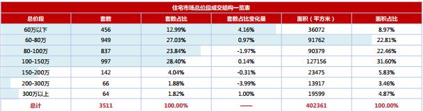 本周全市商品房成交集中于60-150萬之間,其中60-80萬占比27.03%、 80-100萬占比23.84%、 100-150萬占比28.40%;60萬以下產(chǎn)品成交上漲4.16%,其余總價段起伏不大。