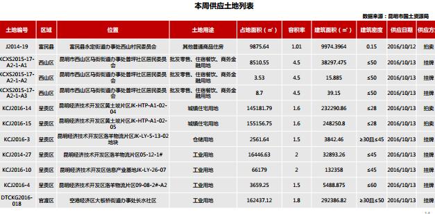 本周土地供應(yīng)11宗,位于西山區(qū)、呈貢區(qū)、官渡區(qū)以及富民縣,土地用途涵蓋批發(fā)零售、住宿餐飲、商務(wù)金融用地,城鎮(zhèn)住宅用地,工業(yè)用地等。本周土地?zé)o成交