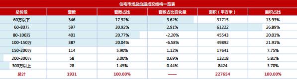 本周全市商品房成交集中于60-150萬之間,其中60-80萬占比30.92%、 80-100萬占比20.77%、 100-150萬占比20.04%,各總價段成交變化不大,市場平穩(wěn)。