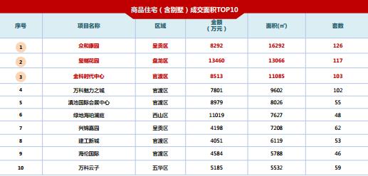點評:本周呈貢區項目眾和康園獲得面積榜冠軍,中航璽樾、金科陽光里分列第二、三名,官渡區有5個項目進入前十。