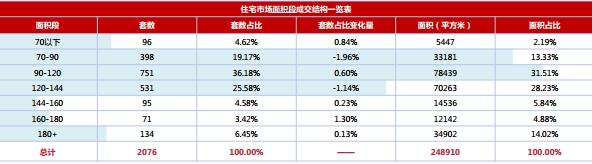 本周成交集中于70-90㎡、 90-120㎡、 120-144㎡三個面積段,分別占全周成交套數的19.17%、 36.18%及25.58%,成交依然以剛需、首改產品為主,各面積段成交起伏不大。