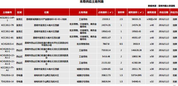 本周土地供應22宗,分別位于呈貢區、西山區以及尋甸縣,土地用途包含工業用地、批發零售、住宿餐飲、商務金融用地,城鎮住宅用地。本周土地無成交。