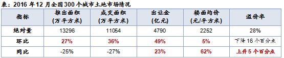 據(jù)中指院研究數(shù)據(jù):2016年,全國300城市土地供需小幅下降,重點城市成交活躍帶動地價及溢價率上揚,出讓金較去年增加三成。一季度受年初淡季及春節(jié)假期影響,供需各項指標均處低位;二三季度熱點城市發(fā)力,在一線供地有限、成交回落的情況下,二線重點城市成為房企競逐熱點,地價與出讓金漲幅較顯著;四季度多地發(fā)布新政穩(wěn)定市場,重點城市由火熱趨向理性,出讓金同比漲幅收窄。